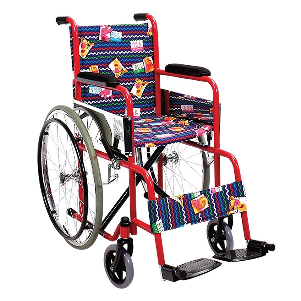 Pediatric wheelchair Foldable chassis Silicone padded rear wheels PU padded front wheels Stainless steel foot pallets Safe braking system High armrests covered with soft fabric Handle suitable for companion use, electrostatic powder coated push ring for a comfortable ride for the user, Velcro system to prevent the feet from falling back and armrests designed with soft fabric in mind. It is a model that has been designed with the comfort and safety of the user in mind.
