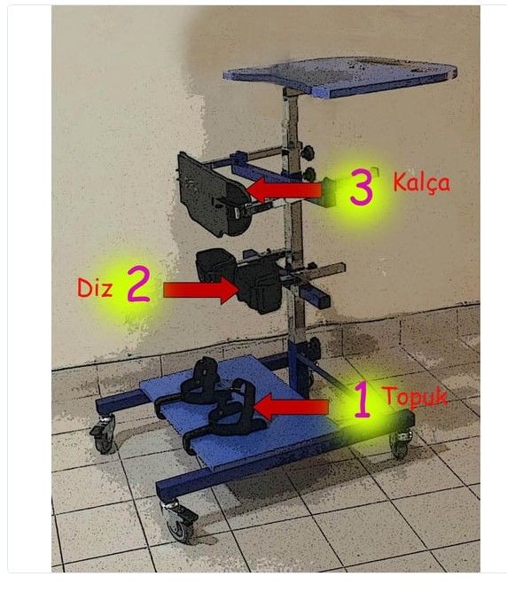 Ayakta durma sandalyesi dik konumlandırma cihazı Ayakta dik durma sehpası vucud dengesine yardımcı ile dik pozisyonunda durabilmesi için 02, yaş çocuk ve yetişkin modelleri ile vucüd dengesine yardımcı olan cihazdır. Cp ayakta durma sehpası kullanımı kullanıcı hastanın cihazın içine girip ayaklarının üstüne basıp. Ayak emniyeti alınır. Diz destek ayarı yapılır. Bel destek bantı bağlanarak kalça dik bağlantı ayarı yapılır. Koltuk altı destek aparatı ile göğüs destek ayarı yapılır. Çalışma masası ayarı kol mesafesi ayarı yapılarak calışma masası ayarı yapılır. Kullanıcının ayaklarını sabitlemek için ayak bağlama mekanizması bacaklarını dik tutmak için diz kapağı destek mekanizması kalça bel dik ayarını sağlamak için kemer sıkma bandajı göğüs omuz dik durma pozisypnu için koltuk altı destek mekanizması ayar mekanizmalarından ayarlanır. Cp ayakta dik durma sehpası çeşitleri kullanıcı hastalar için 3 çeşittir O2 yaş 11 yaş arası kullanıcıları için 11 yaş 16 yaş arası kullanıcılar için 16 yaş 45 yaş arası kullanıcılar için Cp ayakta dik durma sehpası garantisi 2 yıldır kaliteli iskelet yapısı çelik ve ahşap malzemeden üretilmiştir, deforma olmaz Cp ayakta dik durma sehpasının bakım gerektiren her hangi bir mekanizması yoktur. Firmamız tarafından yerli üretim olan cihazın yedek parça sorunu yoktur. Vucud direnci eklem mekanizmalarının gelişimi için fizik tedavi doktorlarının hastasına belli bir program dahilinde tavsiye edilerek alınıp kullanılan cihazdır. Hasta ve hasta sahipleri bu cihazı doktor tavsiyesi ile alınıp kullanılan üründür. Yetişkin ve Çocuk Boyları Vardır.
