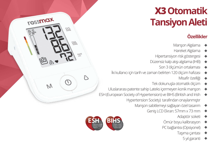 Rossmax X3 Üst Kol Tipi Otomatik Tansiyon Aleti 5 Yıl Garantili, Rossmax markasının sunduğu ergonomik ve kullanıcı dostu bir çözümdür. rossmax x3 ust kol tipi otomatik tansiyon aleti 5 yil garantili kategorisinde yer alan bu ürün, dayanıklı yapısı ve pratik kullanımı ile öne çıkar. Uzun ömürlü materyallerden üretilmiş olup çeşitli kullanıcı ihtiyaçlarına uygun şekilde tasarlanmıştır. Kompakt formu sayesinde yer kaplamaz ve kolay taşınabilir.