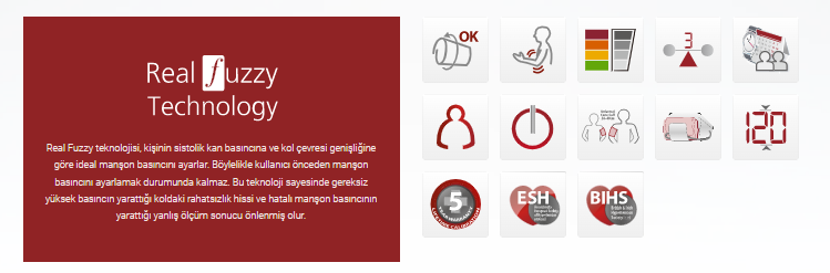 Real-Fuzzy Teknolojisi: Real Fuzzy teknolojisi, kişinin sistolik kan basıncına ve kol çevresi genişliğine göre ideal manşon basıncını ayarlar. Böylelikle kullanıcı önceden manşon basıncını ayarlamak durumunda kalmaz. Bu teknoloji sayesinde gereksiz yüksek basıncın yarattığı koldaki rahatsızlık hissi ve hatalı manşon basıncının yarattığı yanlış ölçüm sonucu önlenmiş olur.